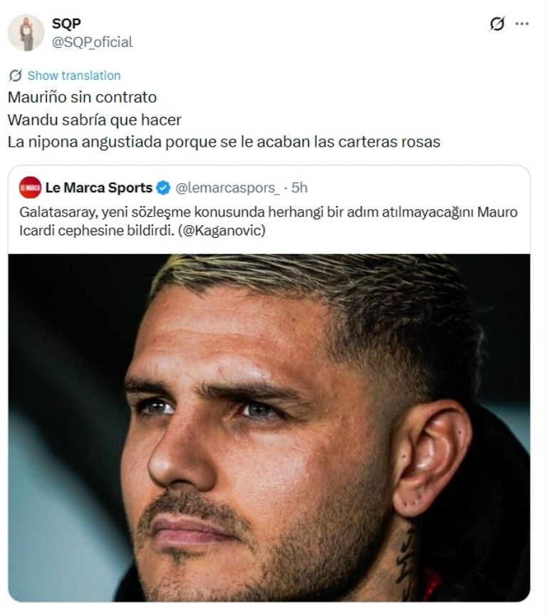 "Mauriño sin contrato. Wandu sabría que hacer. La nipona angustiada porque se le acaban las carteras rosas", escribieron en la cuenta de X de SQP.