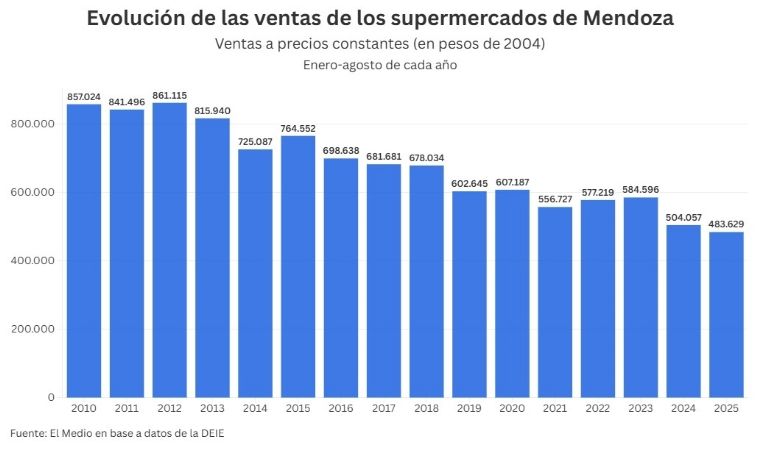 Ahora bien, si se analiza lo ocurrido en los primeros ocho meses de cada año, a pesos constantes de 2004, se encuentra que el peor año de la serie estadística es el 2025. Según la DEIE, los supermercados de Mendoza facturaron entre enero y agosto $483.629.000 (en pesos de 2004). Ese número es inferior a los $504.057.000 del 2024 y mucho menor que el de los años anteriores. De hecho, en el largo plazo se observa una tendencia decreciente casi constante.