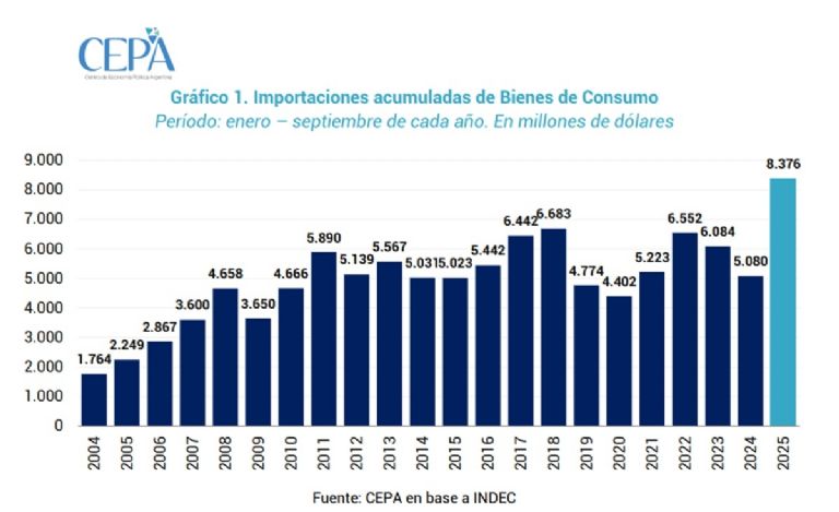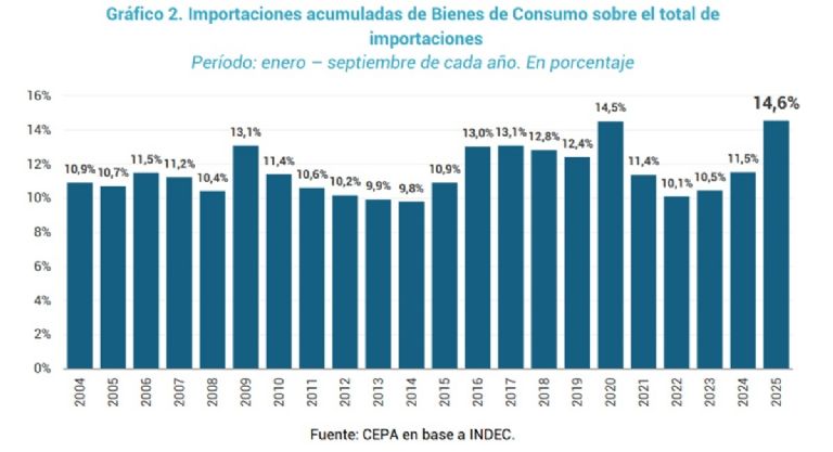 El estudio del CEPA señala que en septiembre de 2025, por tercer mes consecutivo, las importaciones de Bienes de Consumo marcaron un nuevo máximo histórico. Totalizaron 1.157 millones de dólares, mientras que en el acumulado enero-septiembre alcanzaron 8.376 millones de dólares, el valor más alto de la serie con origen en 2004. Este monto supera en 1.693 millones de dólares el récord previo, registrado en el mismo período de 2018, lo que implica un incremento del 25,3%. En términos relativos, las importaciones de Bienes de Consumo representan el 14,6% del total de importaciones de bienes en 2025, ubicándose 4,1 puntos porcentuales por encima del mismo período de 2023.