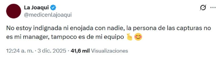 Mel Schvartz, la manager real de La Joaqui, se comunicó con la Agencia Noticias Argentinas (NA) para poner fin a las especulaciones. Schvartz afirmó que la información difundida era falsa y negó cualquier tipo de conflicto con las partes mencionadas.