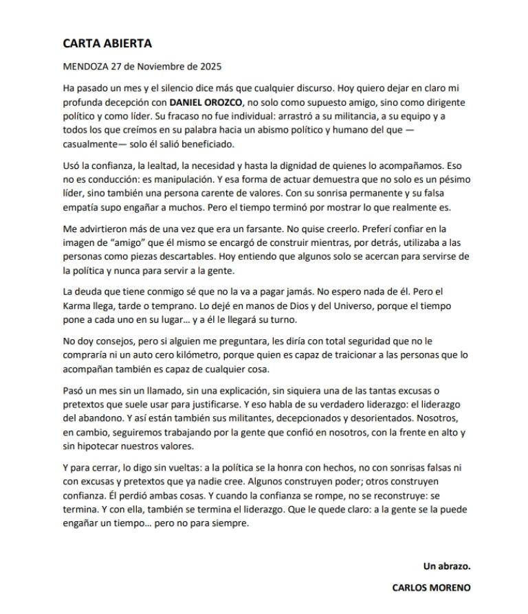 En los últimos días circuló una carta abierta firmada por un amigo del médico en la que se queja de deudas impagas y recomienda no comprarle "ni un auto cero kilómetro" al exintendente de Las Heras. También se dice que su esposa, Janina Ortiz, le habría puesto precio a su renuncia como diputada provincial. Actualmente está suspendida y no puede ocupar su banca.