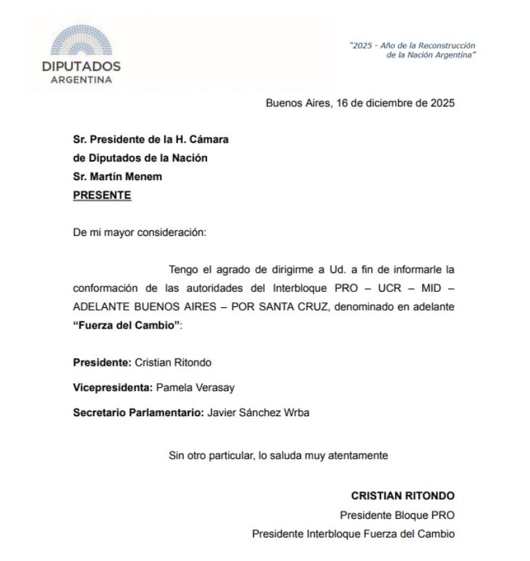 De a poco comienzan a acomodarse las fichas en el tablero y el Congreso de la Nación se perfila para un año en el que se discutirán reformas de fondo como la ley laboral. De cara a ese escenario, este martes se confirmó la creación de un interbloque que unirá al PRO, la UCR, el MID y Adelante Buenos Aires. El espacio es presidido por Cristian Ritondo (PRO) y la vicepresidenta es la diputada cornejista Pamela Verasay.