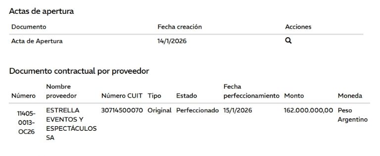 Finalmente el viernes 16 de enero se adjudicó a la empresa Estrella Eventos y Espectáculos el servicio por un total de 162 millones de pesos. Fueron el único oferente e incluso les permiten ampliar el monto por otros 48 millones de pesos en caso de que sea necesario.