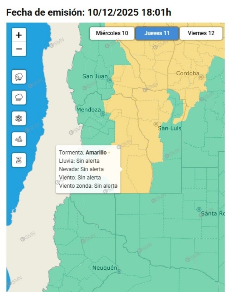 En el Sistema de Alerta del SMN el color amarillo implica “posibles fenómenos meteorológicos con capacidad de daño y riesgo de interrupción momentánea de actividades cotidianas”.