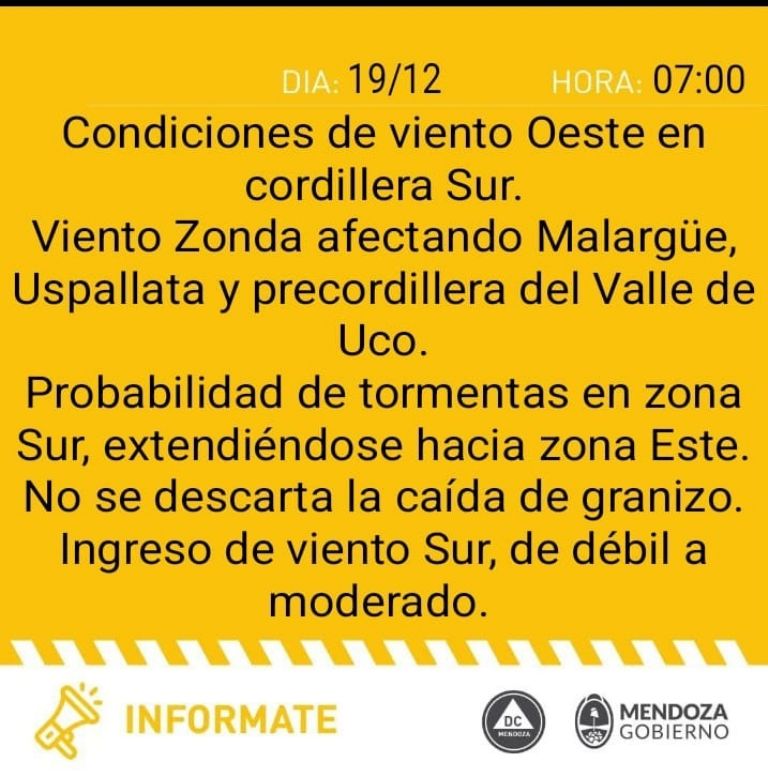El SMN mantiene vigente una alerta amarilla por viento Zonda. El fenómeno afectará principalmente a la precordillera, el departamento de Malargüe y sectores del Valle de Uco y Uspallata. Se esperan ráfagas que podrían alcanzar los 70 km/h, lo que generará un ambiente extremadamente seco y una reducción importante de la visibilidad por polvo en suspensión entre el mediodía y las 23:00.