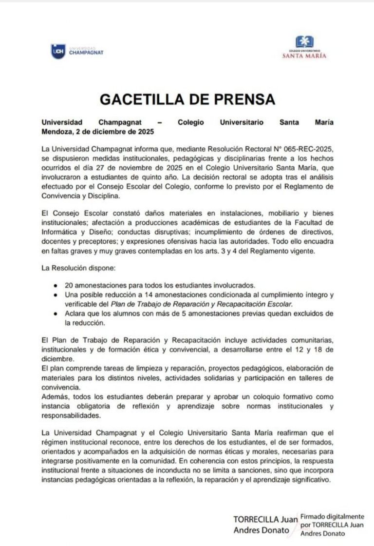 Tras los violentos hechos, la institución decidió aplicar "medidas extraordinarias" contra un grupo de 115 alumnos. "La rectoría dispuso 20 amonestaciones y un Plan de Reparación y Recapacitación Escolar para los alumnos involucrados, condicionando la reducción de sanciones al cumplimiento de tareas comunitarias y formativas", indicó el comunicado que divulgó la escuela.