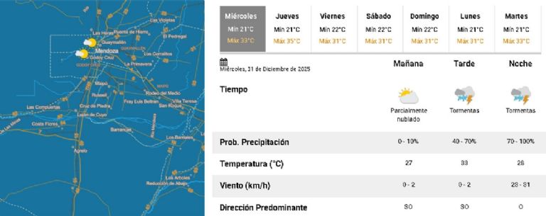 - Tormentas aisladas: el SMN emitió una alerta amarilla para la tarde y noche de hoy. El aviso abarca el Este de Las Heras, Lavalle, San Martín, Santa Rosa y La Paz.