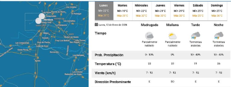 El reporte oficial de Contingencias Climáticas de Mendoza para este lunes 12 destaca una jornada "calurosa con nubosidad variable y tormentas aisladas", según su pronóstico. El factor clave será el viento: se esperan ráfagas moderadas del sector sur, lo que ayudará a que la temperatura no escale hasta los niveles sofocantes que se temían originalmente.