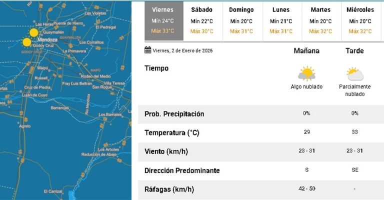 - Contingencias Climáticas (Gobierno de Mendoza): el ente local es un poco más conservador con la temperatura máxima, situándola en 34°C, pero añade un factor clave: el ingreso de un frente frío. Según Contingencias, el día presentará "poca nubosidad con descenso de la temperatura hacia la noche" y vientos moderados a algo fuertes del sector sur.