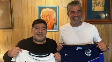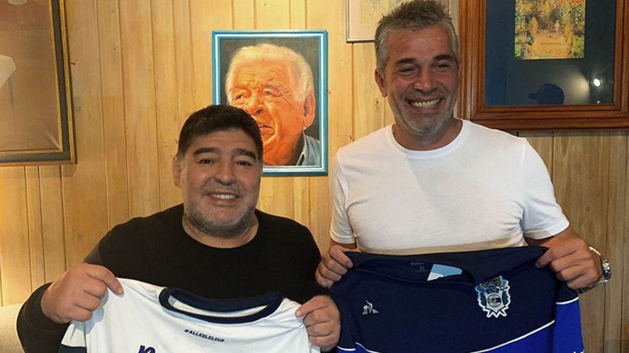 Diego Maradona junto al por entonces presidente de Gimnasia y Esgrima de La Plata, Gabriel Pellegrino, cuando acordó su llegada al Lobo.. Foto: Noticias Argentinas