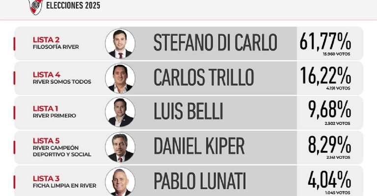 Stefano Di Carlo, quien fue elegido como el nuevo presidente de River Plate, arrasó y le asegura la continuidad al proyecto oficialista que encabezaron Rodolfo D’Onofrio y Jorge Brito y uno de sus principales objetivos será hacer un Monumental de primer mundo.