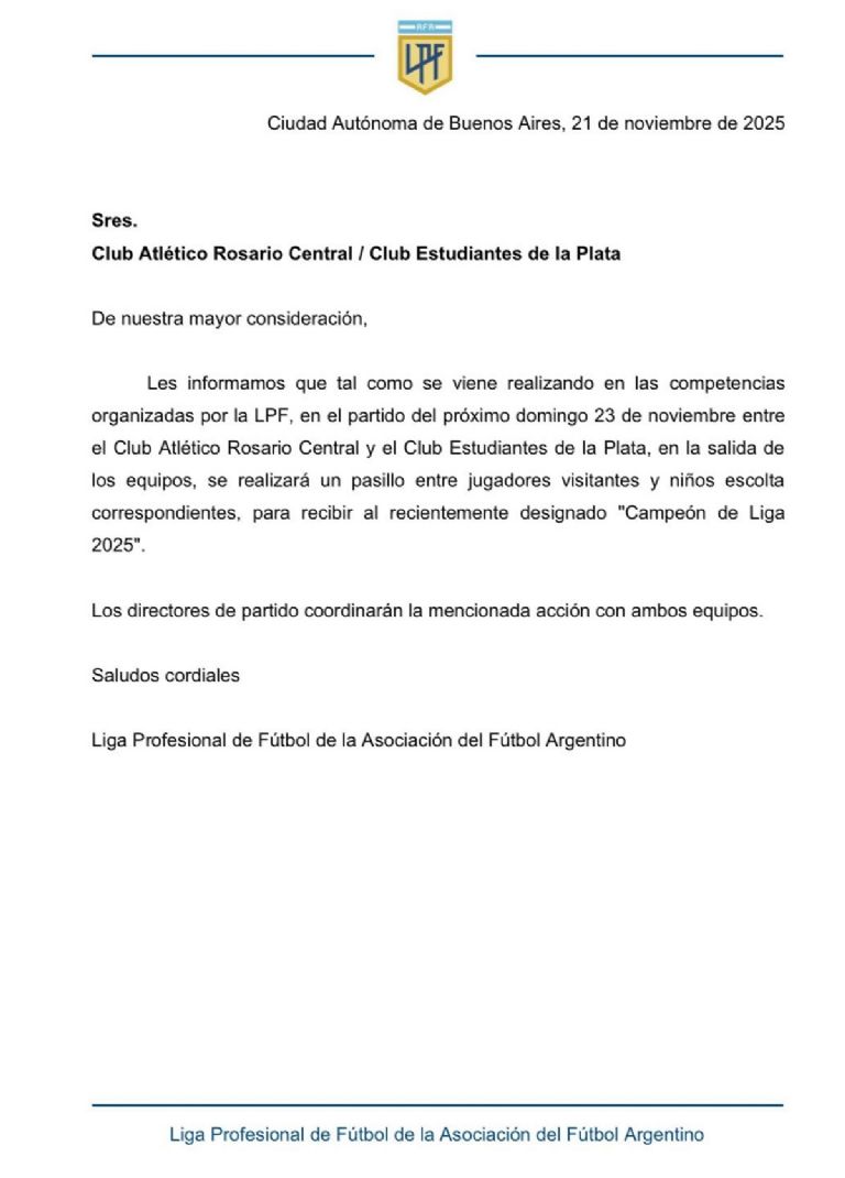 “Tal como se viene realizando en las competiciones organizadas por la Liga Profesional de Fútbol, en la salida de los equipos se realizará un pasillo entre jugadores visitantes y niños escoltas, para recibir al recientemente designado Campeón de la Liga 2025”.