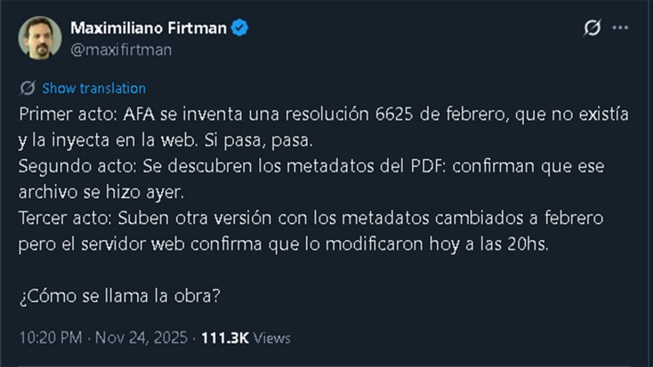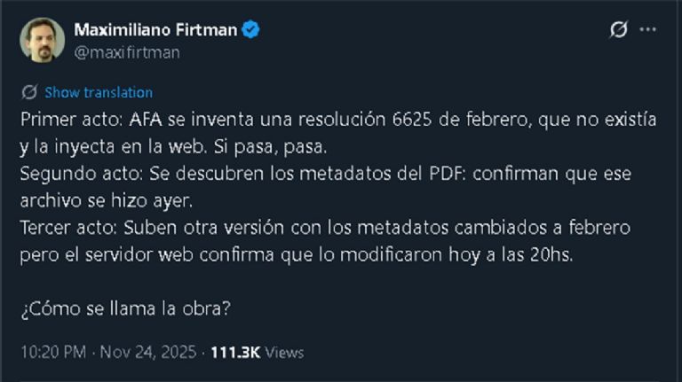 El documento en el que se ampara la AFA para sancionar a Estudiantes es el Boletín N°6625, cuya fecha data del 12 de febrero del 2025, pero cuando se ingresa a los detalles del PDF se observa que fue creado el 23 de noviembre a las 19:21, en pleno encuentro entre el Pincha y Rosario Central.