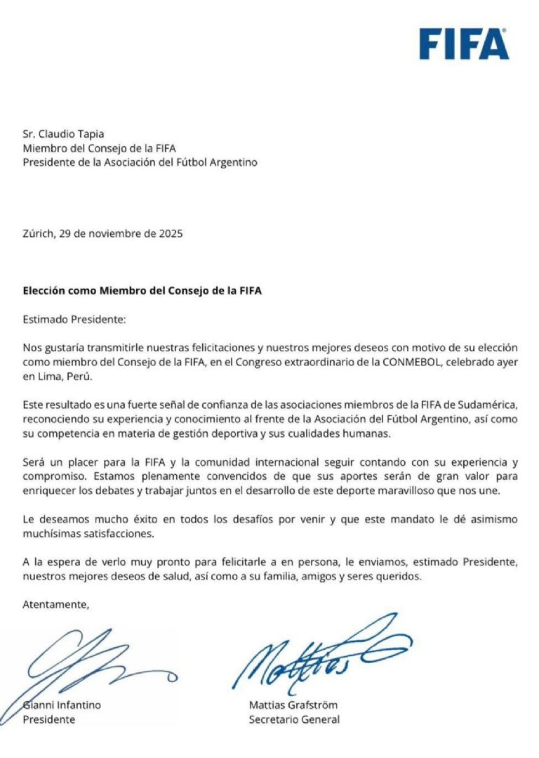 Gianni Infantino, presidente de la FIFA, felicitó oficialmente a Tapia por su confirmación como miembro del Consejo de la FIFA hasta 2026, enviándole una carta que fue interpretada como un fuerte mensaje de apoyo institucional en medio de los escándalos que atraviesa la AFA. Veamos: