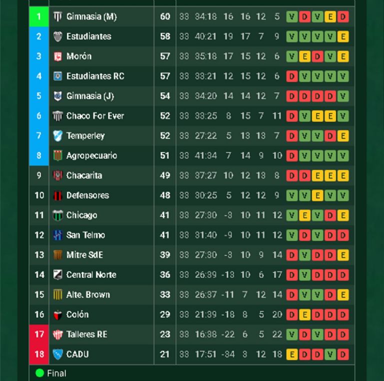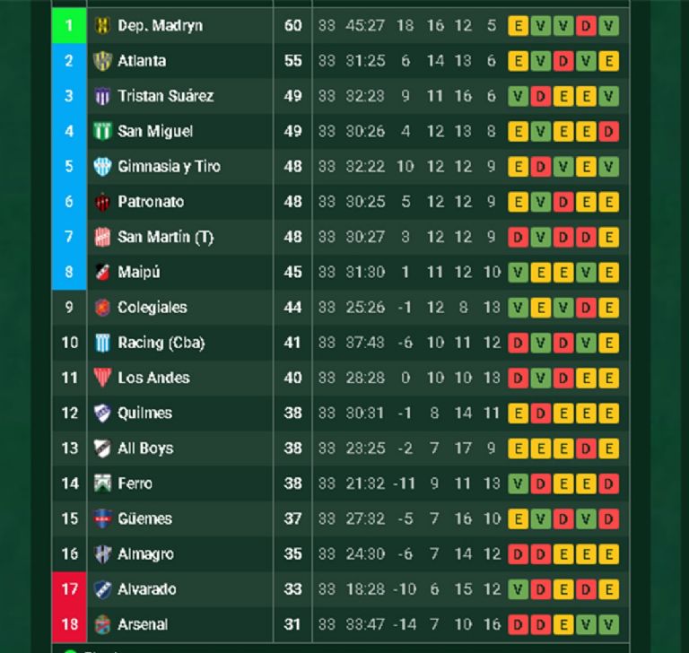 1-Deportivo Madryn clasificó a la final por el primer ascenso 2-3-4-5-6 y 7-Atlanta, Tristán Suárez, San Miguel, Gimnasia y Tiro, Patronato y San Martín de Tucumán clasificaron al Reducido 8 y 9-Maipú y Colegiales definen un puesto en el Reducido
