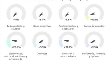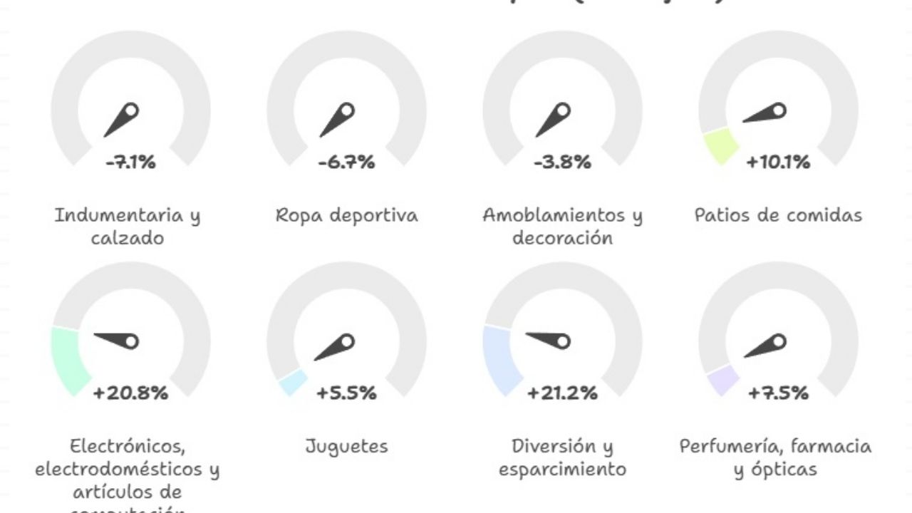 Por su parte, los rubros que mejoraron en el período enero-julio fueron los "patios de comidas" (10,1% de crecimiento), "electrónicos, electrodomésticos y artículos de computación" (20,8%), "juguetes" (5,5%), "diversión y esparcimiento" (21,2%), "perfumería, farmacia y ópticas" (7,5%)