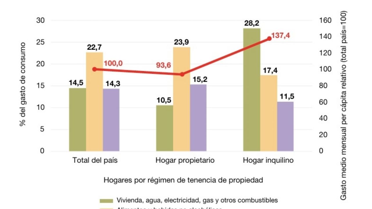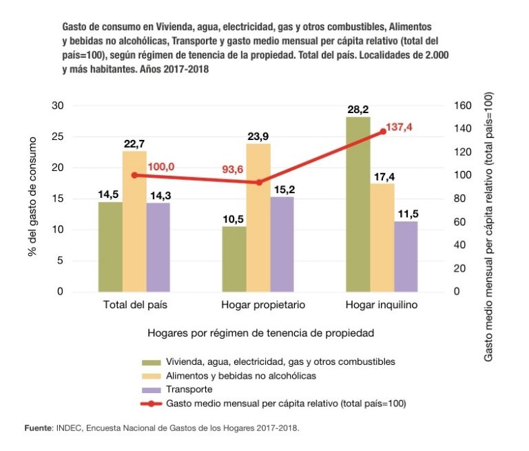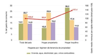 El informe también muestra diferencias por tipo de vivienda: los hogares inquilinos destinan un 28,2% de su gasto total a vivienda, agua, electricidad y gas, frente al 10,5% de los propietarios. Y en salud, el gasto promedio alcanza el 11,4% entre quienes tienen prepaga, mientras que se reduce al 3,5% entre los hogares con atención pública.
