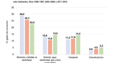 El estudio muestra cómo evolucionaron los hábitos de consumo en las últimas dos décadas. En 1996-1997 los alimentos concentraban el 28,8% del gasto total, mientras que en la última encuesta bajaron al 22,7%. En el mismo período, transporte pasó del 11,2% al 14,2%, y comunicaciones del 2,6% al 5,2%, reflejando el peso creciente de la tecnología y la conectividad en la vida cotidiana.