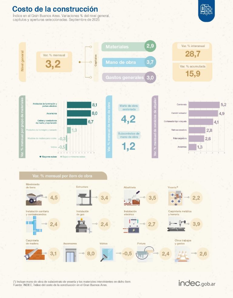 El nivel general del Índice del costo de la construcción(ICC) en el Gran Buenos Aires registró una suba de 3,2% en septiembre, respecto al mes anterior, de acuerdo con el informe difundido hoy por el Instituto Nacional de Estadística y Censos (Indec).