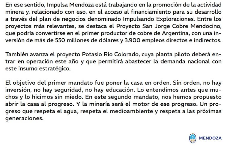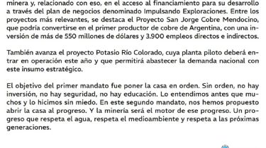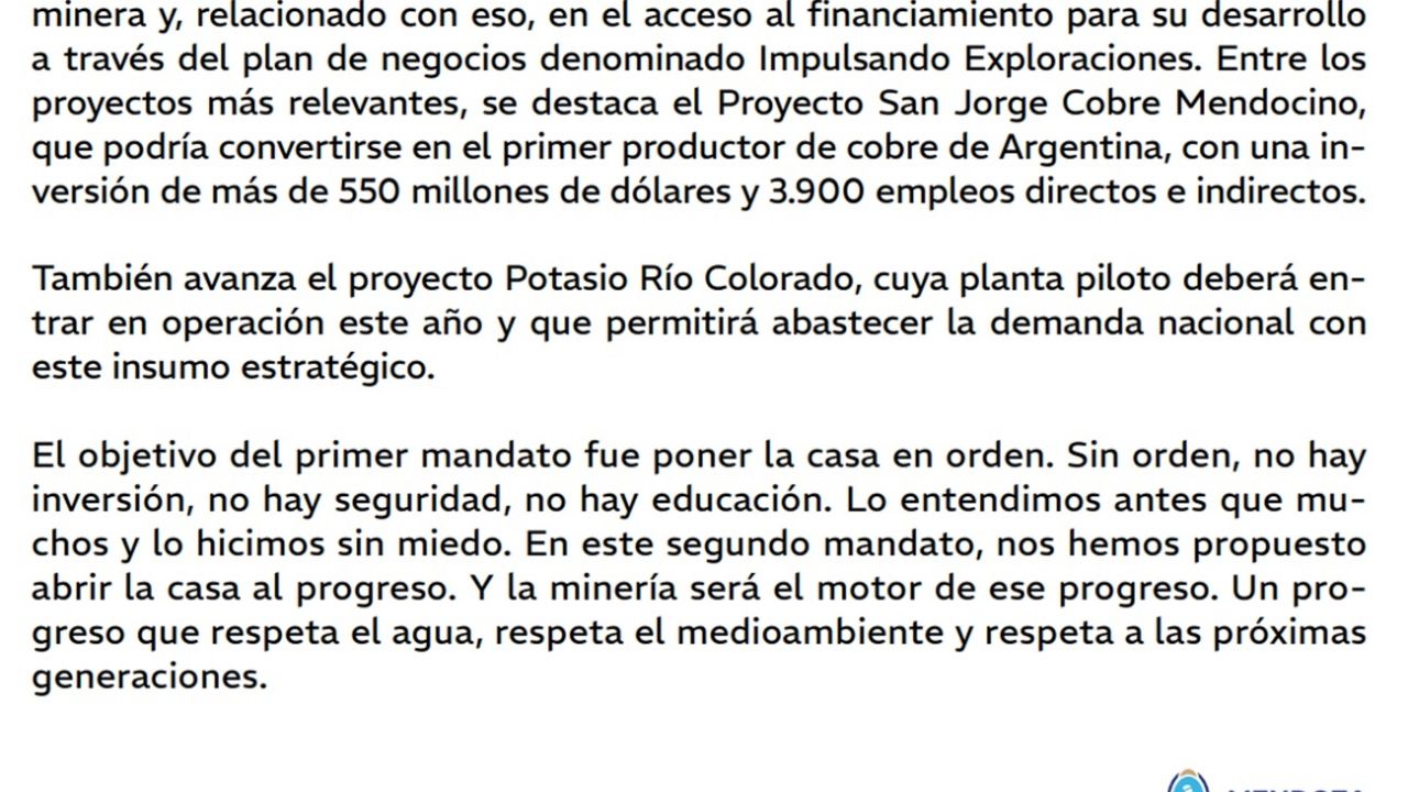 En la Asamblea Legislativa del 1 de mayo pasado, el mandatario Alfredo Cornejo, además de volver con sus frases recurrentes sobre el orden y lo eficiente que cree ser en el manejo de la administración pública (es tan eficiente que gastamos $ 400 millones por incumplimientos en el Ecoparque que no termina hace casi 10 años) y luego de apelar al desarrollo minero de Mendoza, dijo: “También avanza el proyecto Potasio Río Colorado, cuya planta piloto deberá entrar en operación este año y que permitirá abastecer la demanda nacional con este insumo estratégico”.