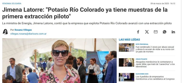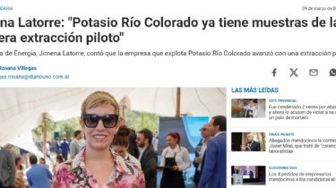 Pero, Cornejo no fue el único al que se le fue la lengua con el tema Potasio Río Colorado. Dos meses antes, a la ministra de Energía, Jimena Latorre, le pareció algo parecido en la Vendimia Solidaria.