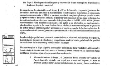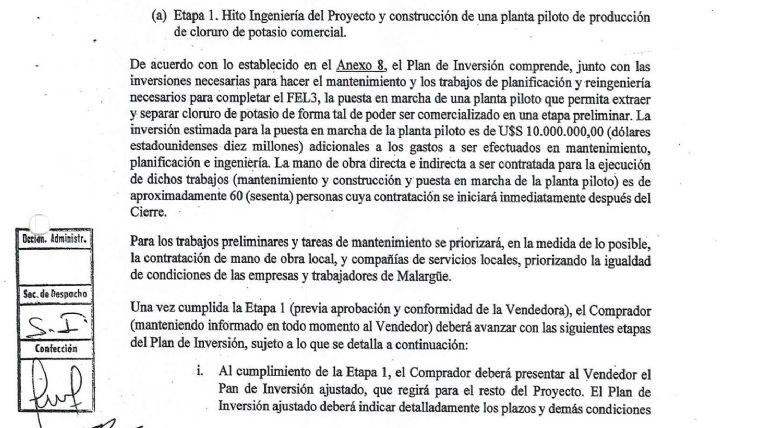 En el contrato firmado entre Suárez y los empresarios, se indica que pasada la Etapa 1, que sería la de la construcción de la planta piloto en la que debían invertir 10 millones de dólares, y la planificación y reingeniería del proyecto (FEL -Front End Loading- 3), “los empresarios deben presentar un plan de inversión para el resto del proyecto, con plazos, condiciones técnicas y montos a invertir en cada año subsiguiente y la clasificación de cada una de esas obligaciones como de importancia esencial, media o baja”.