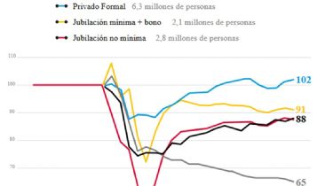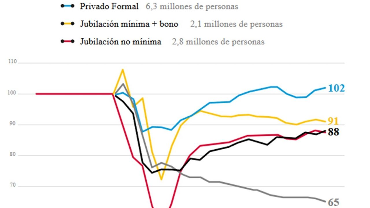 Desde fines de 2023, “de menor a mayor, la pérdida de ingresos acumulada, medida en cantidad de meses, durante la gestión Milei fue: asalariado privado formal (0,7 meses); jubilación mínima (2,3); empleado público provincial (3,6); jubilación arriba de la mínima (4,2) y empleado público nacional (5,8)”, señala el Informe.