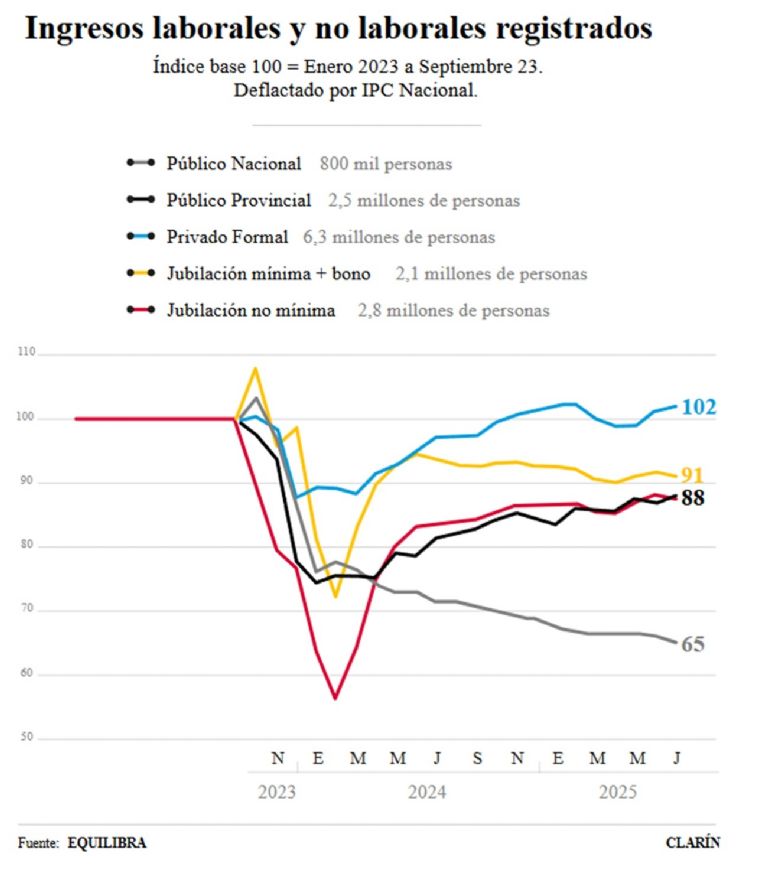Sobre un universo de 14,5 millones de personas registradas (asalariados formales, más jubilados) nadie se salvó de perder ingresos durante la gestión de Javier Milei, mostrando una trayectoria de “desencanto”, afirma la consultora Equilibra, sobre la base de datos oficiales.