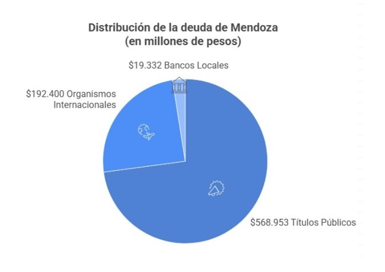 Del total del endeudamiento mendocino, $568.953 millones corresponden a títulos públicos, mientras que $192.400 millones son compromisos con organismos internacionales, y $19.332 millones con bancos locales. En tanto, no se registran pasivos con el Gobierno nacional ni con los fondos fiduciarios federales, lo que marca una composición diversificada pero altamente dependiente del financiamiento externo.