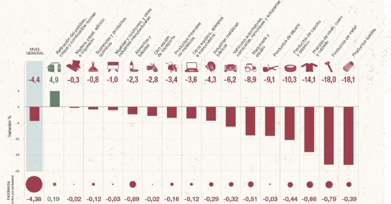 Quince de dieciséis divisiones industriales cayeron anualmente. Las mayores bajas se registraron en productos textiles (-18,1%), productos de metal (-18,0%) y prendas de vestir (-14,1%), afectadas por la menor demanda interna y la competencia importada.