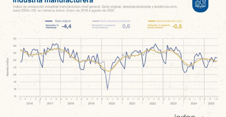 El IPI mostró una caída de 4,4% respecto a igual mes de 2024, mientras que en el acumulado de enero-agosto de 2025 se registró un incremento de 4,4% respecto a igual período de 2024. En agosto, el índice de la serie desestacionalizada muestra una variación positiva de 0,6% respecto al mes anterior.