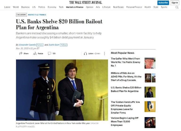 La noticia, difundida este jueves por el influyente diario estadounidense The Wall Street Journal, sacudió la tranquilidad de la City porteña: el ambicioso plan de rescate financiero de US$20.000 millones que el gobierno de Javier Milei negociaba para estabilizar su programa económico ha sido "archivado" por los grandes actores de Wall Street.