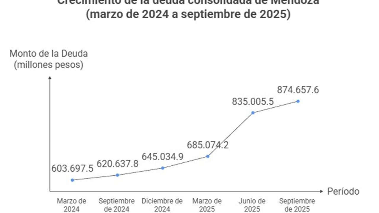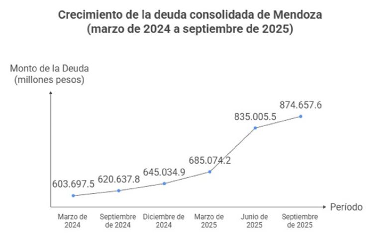La deuda pública consolidada de Mendoza aumentó más de 40% en el lapso de un año, de acuerdo con los registros de la Dirección de Estadísticas e Investigaciones Económicas (DEIE). Un cuadro difundido por el organismo presenta la evolución trimestral del endeudamiento provincial entre marzo de 2024 y septiembre de 2025 y permite observar un incremento sostenido en la mayor parte de los componentes que conforman el stock total.