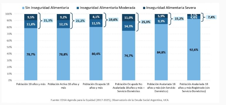 Al puntualizar en la afectación de los problemas alimentarios para los empleados formales asegura que eso “refleja un problema que trasciende la mera inserción laboral”, aunque reconoce que “los trabajadores sin aportes a la seguridad social presentan niveles de inseguridad alimentaria notablemente superiores en comparación con aquellos con aportes”.