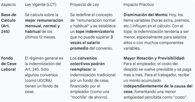 - Tope indemnizatorio: se redefine la base de cálculo y se establece un tope indemnizatorio que no puede superar tres veces el salario promedio del convenio aplicable, aunque la indemnización no podrá ser inferior al 67% de la remuneración normal y habitual.
