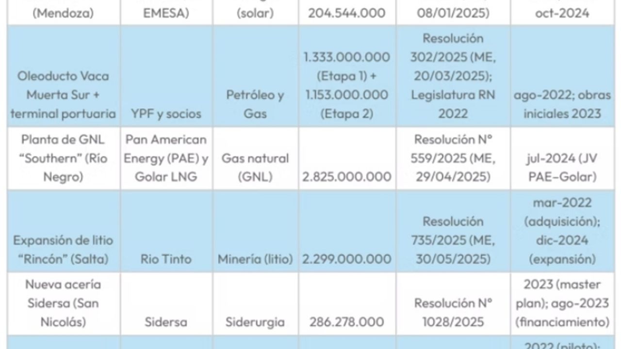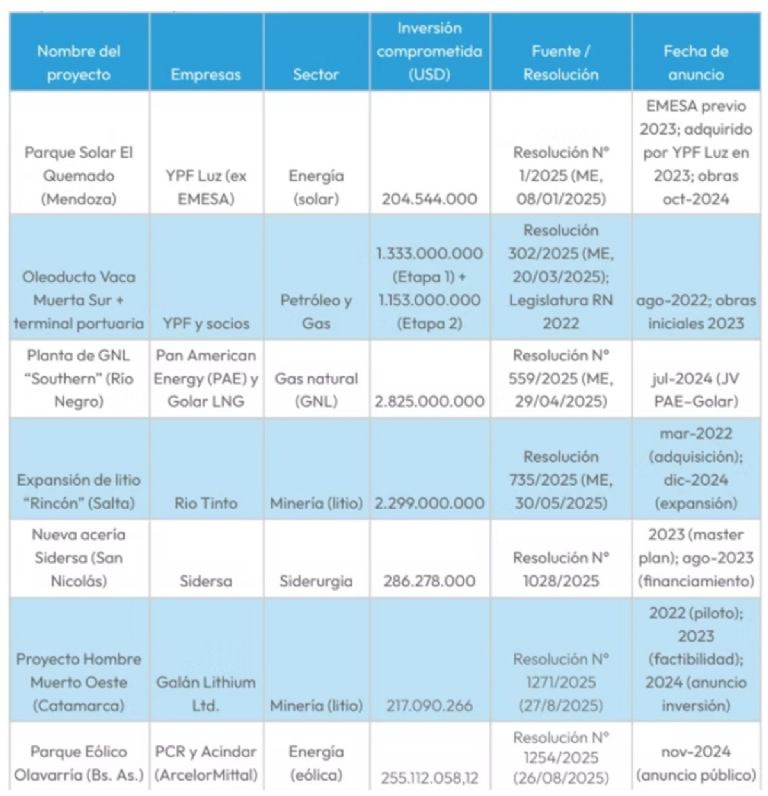 - Primero, la mayoría de las inversiones incluidas ya estaban en ejecución o habían sido anunciadas mucho antes de la sanción de la Ley Bases, por lo que el régimen se limitó a otorgar beneficios extraordinarios a emprendimientos que de todos modos iban a realizarse.