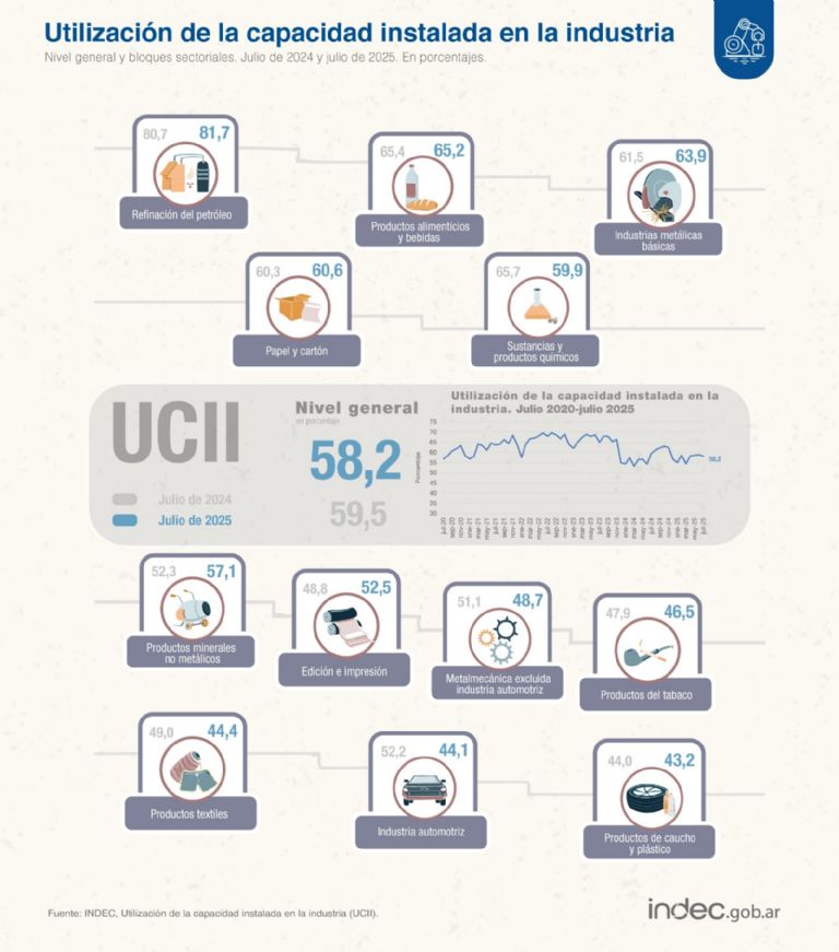 En julio, la utilización de la capacidad instalada en la industria fue del 58,2%, quedando por debajo del número del mismo mes del 2024 y lo mismo con respecto a junio, según difundió el Instituto Nacional de Estadísticas y Censos (INDEC).