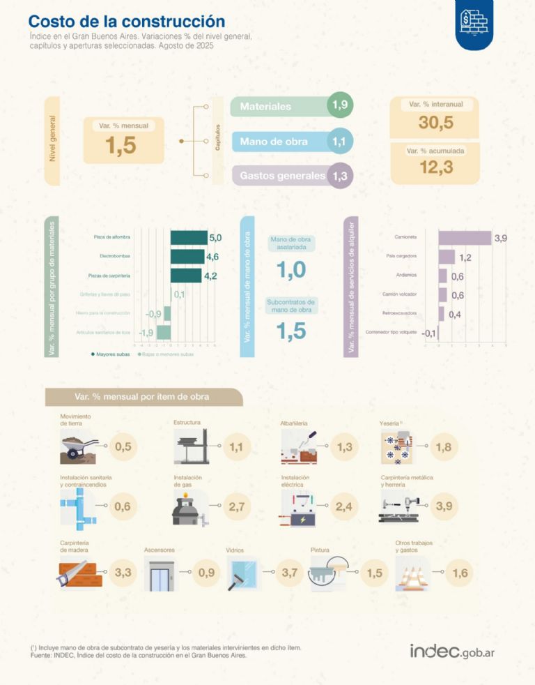 El nivel general del Índice del costo de la construcción (ICC) en el Gran Buenos Aires correspondiente a agosto de 2025 registró una suba de 1,5% respecto al mes anterior. Este resultado es consecuencia de las alzas de 1,9% en materiales, 1,1% en mano de obra y 1,3% en gastos generales.