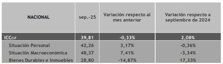 - Bienes Durables e Inmuebles: Este subíndice retrocedió un 14,87% respecto a agosto. Dentro de este componente, la disposición a la compra de automóviles y casas cayó un 21% y la de electrodomésticos un 10,7%. A pesar de la caída mensual, el indicador general de bienes durables se encuentra un 17,33% por encima del nivel de un año atrás.