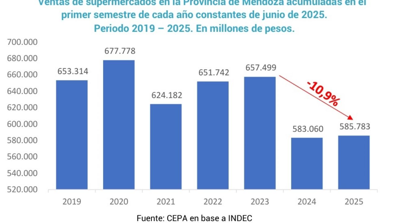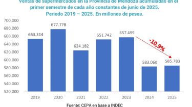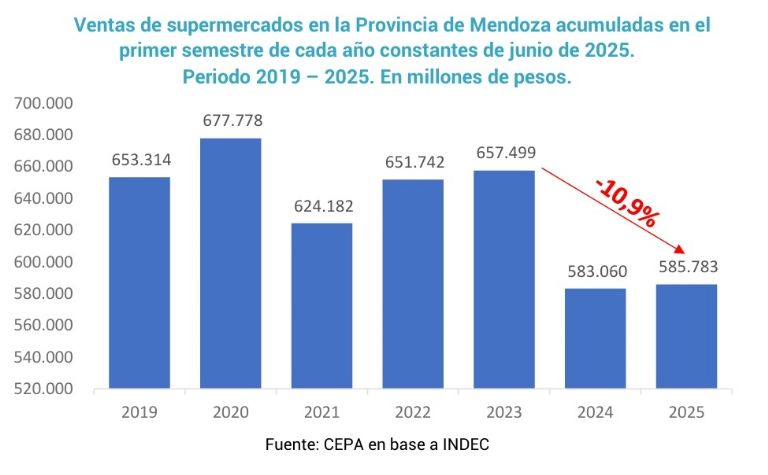 Las ventas en supermercados de Mendoza tuvieron un repunte marginal del 0,5% en el primer semestre de 2025 frente al mismo período del año pasado. Sin embargo, esa mejora no alcanza a compensar el retroceso previo: el nivel actual de facturación se ubica 10,9% por debajo del primer semestre de 2023 y 10,1% por debajo de 2022, en precios constantes de junio de 2025.