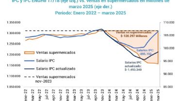 Si la medición se realiza con la canasta actualizada de gastos de los hogares (ENGHo 2017-2018), el deterioro resulta aún mayor: la pérdida alcanza 7,6% en el mismo período. Bajo este criterio, la correlación con el consumo es directa, ya que las ventas de supermercados en marzo de 2025 se ubicaron 12% por debajo de noviembre de 2023.