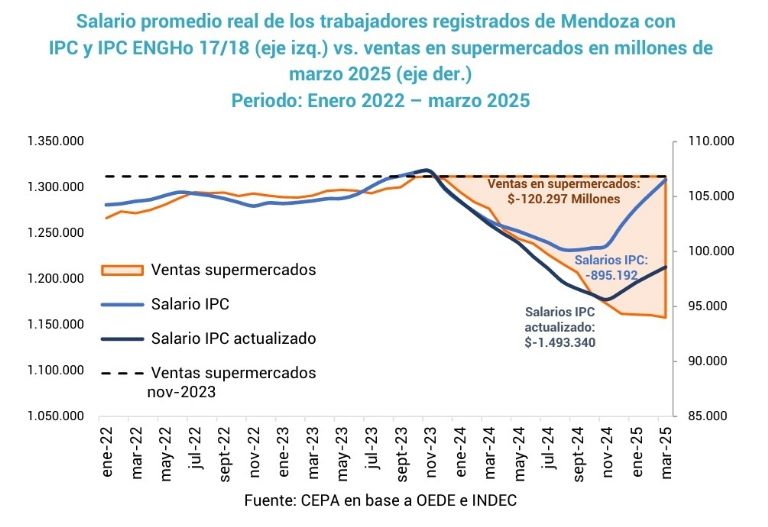 Según el estudio del CEPA, el retroceso de las ventas se vincula de manera directa con la pérdida de poder adquisitivo. "Entre noviembre de 2023 y septiembre de 2024, los trabajadores registrados de Mendoza vieron caer sus ingresos reales en 6,5%. A pesar de una leve recuperación a fines de 2024 y comienzos de 2025, en marzo de este año los salarios aún se encontraban 0,7% por debajo del nivel de noviembre de 2023", señala el informe.