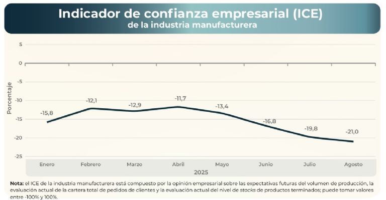 La Encuesta de Tendencia de Negocios de la industria manufacturera -elaborado por Indec- refleja un marcado retroceso en la percepción empresaria. En agosto de 2025, el Indicador de Confianza Empresarial (ICE) del sector se ubicó en -21%, profundizando una caída sostenida desde comienzos del año.
