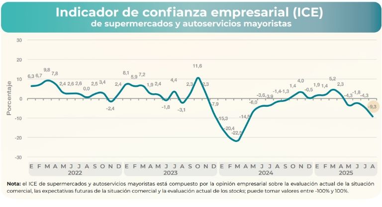 Un segundo informe del Indec, sobre supermercados y autoservicios mayoristas, arroja un panorama igualmente negativo. En agosto, el ICE del sector se ubicó en -9,3%, en línea con la tendencia descendente observada en los últimos meses. Se trata del peor resultado desde que se realiza la medición para ese sector (enero de 2025).