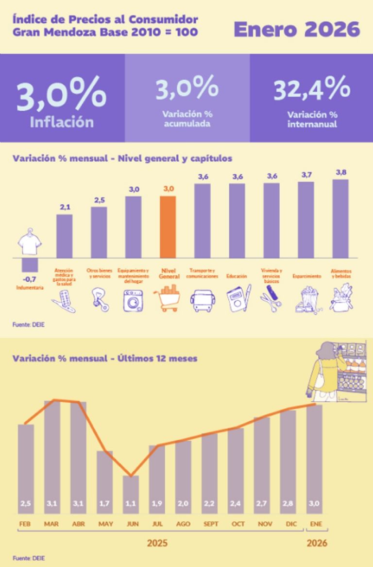 En Mendoza el IPC fue del 3%, dos décimas por encima del indicador de enero que dio 2,8%. Los rubros que más incrementaron sus precios fueron: