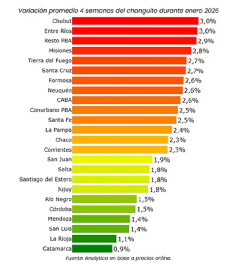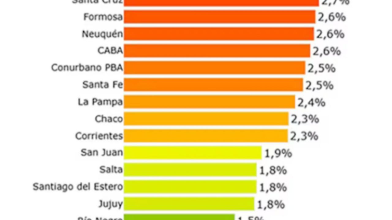 Chubut, Entre Ríos y el interior de la provincia de Buenos Aires fueron las regiones donde la variación mensual del carrito de supermercado fue mayor. Registraron un alza de 3% y 2,9%, respectivamente durante el mes pasado. Por el contrario, Catamarca tuvo subas por debajo de 1%.