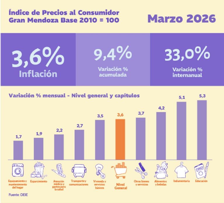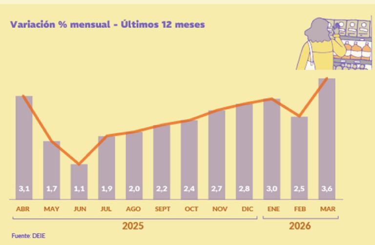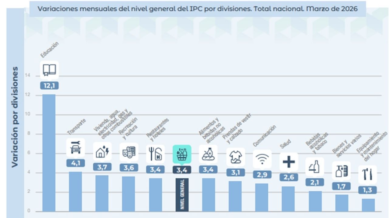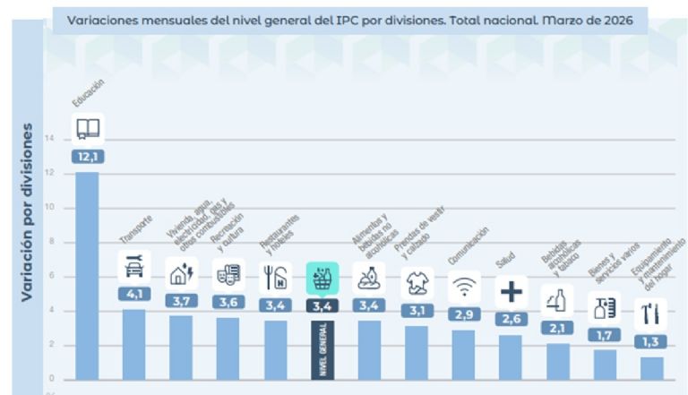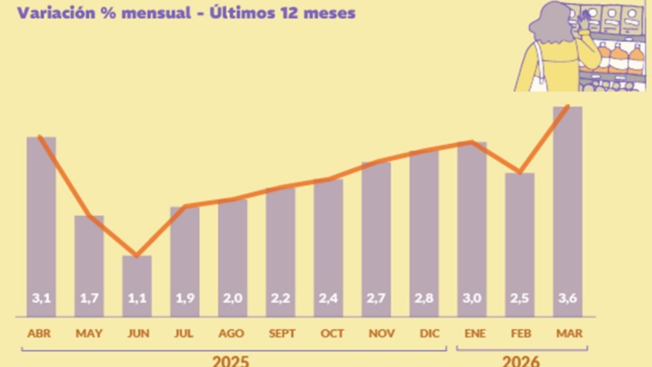 La inflación de marzo fue de 3,4%, según el Índice de Precios al Consumidor (IPC) dado a conocer este martes por el Instituto Nacional de Estadística y Censos (INDEC). La suba de precios de enero y de febrero había sido del 2,9% en ambos meses y los entendidos indican que se siente el impacto de la guerra en Medio Oriente, entre otros factores.