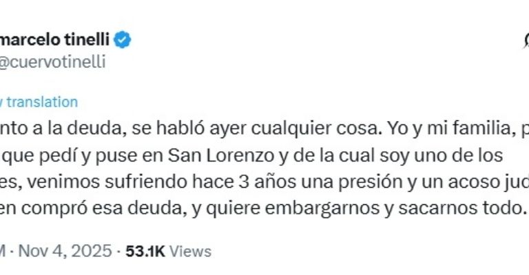“Yo y mi familia, por dinero que pedí y puse en San Lorenzo y de la cual soy uno de los garantes, venimos sufriendo hace 3 años una presión y un acoso judicial de quien compró esa deuda, y quiere embargarnos y sacarnos todo”, agregó sobre ese tema.