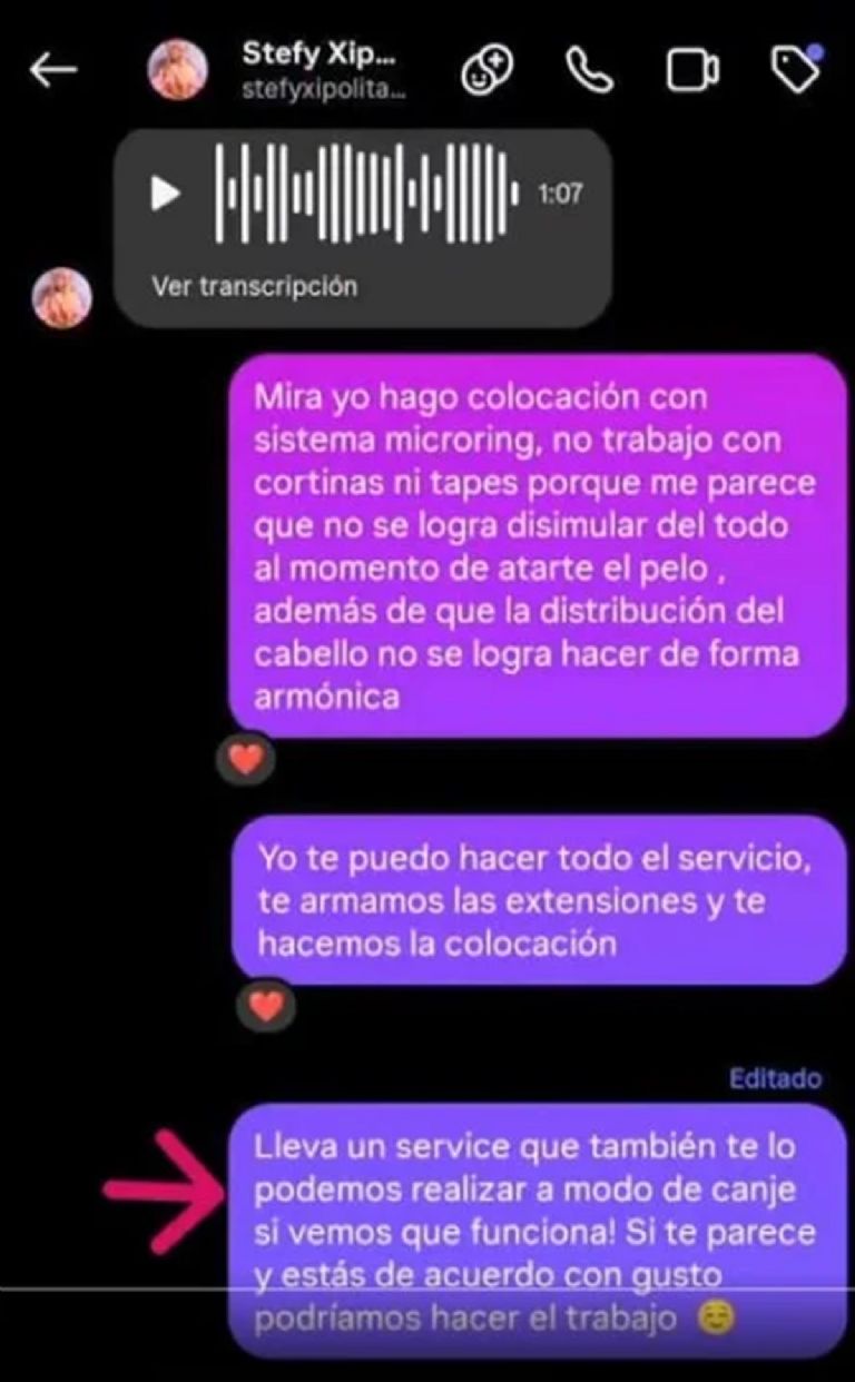Tras un audio de la ex vedette, desde el comercio explicaron: “Hago colocación con sistema microring, no trabajo con cortinas ni tapes porque me parece que no se logra disimular del todo al momento de atarte el pelo, además de que la distribución del cabello no queda de forma armónica”.