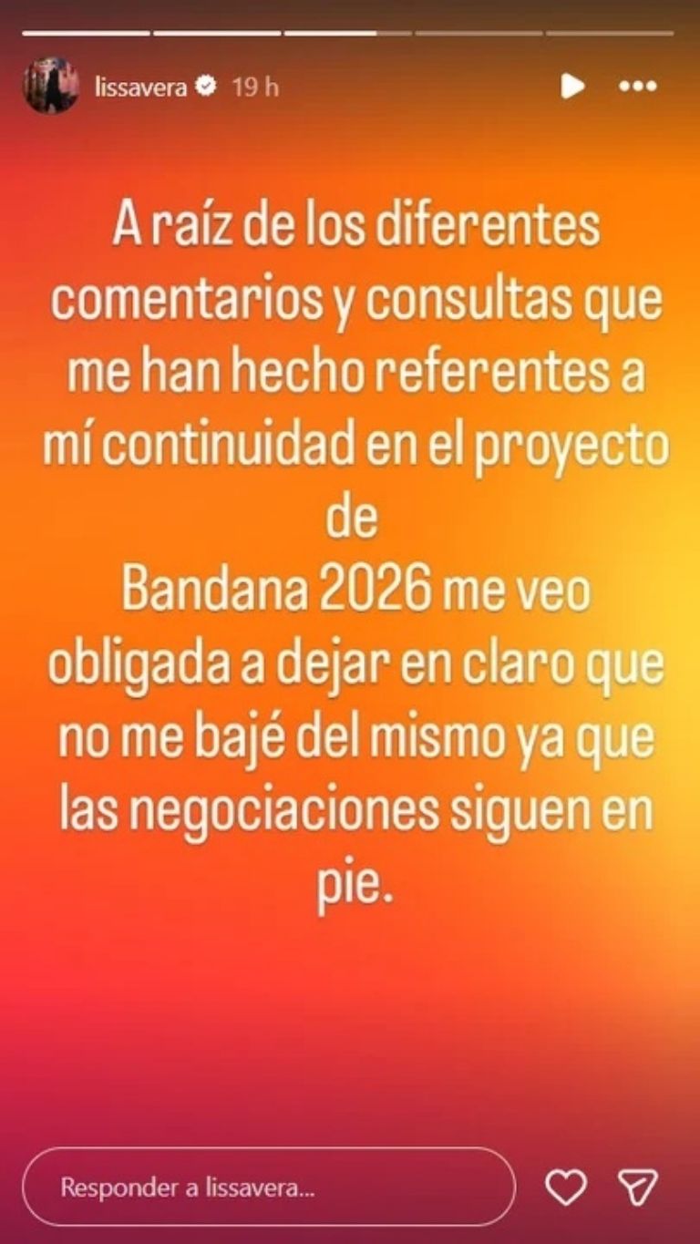 Lissa Vera utilizó sus redes sociales para cortar de raíz los trascendidos. Mediante un comunicado difundido el lunes por la tarde, la cantante fue clara y contundente: “A raíz de los diferentes comentarios y consultas que me han hecho referentes a mi continuidad en el proyecto de Bandana 2026, me veo obligada a dejar en claro que no me bajé del mismo, ya que las negociaciones siguen en pie”.